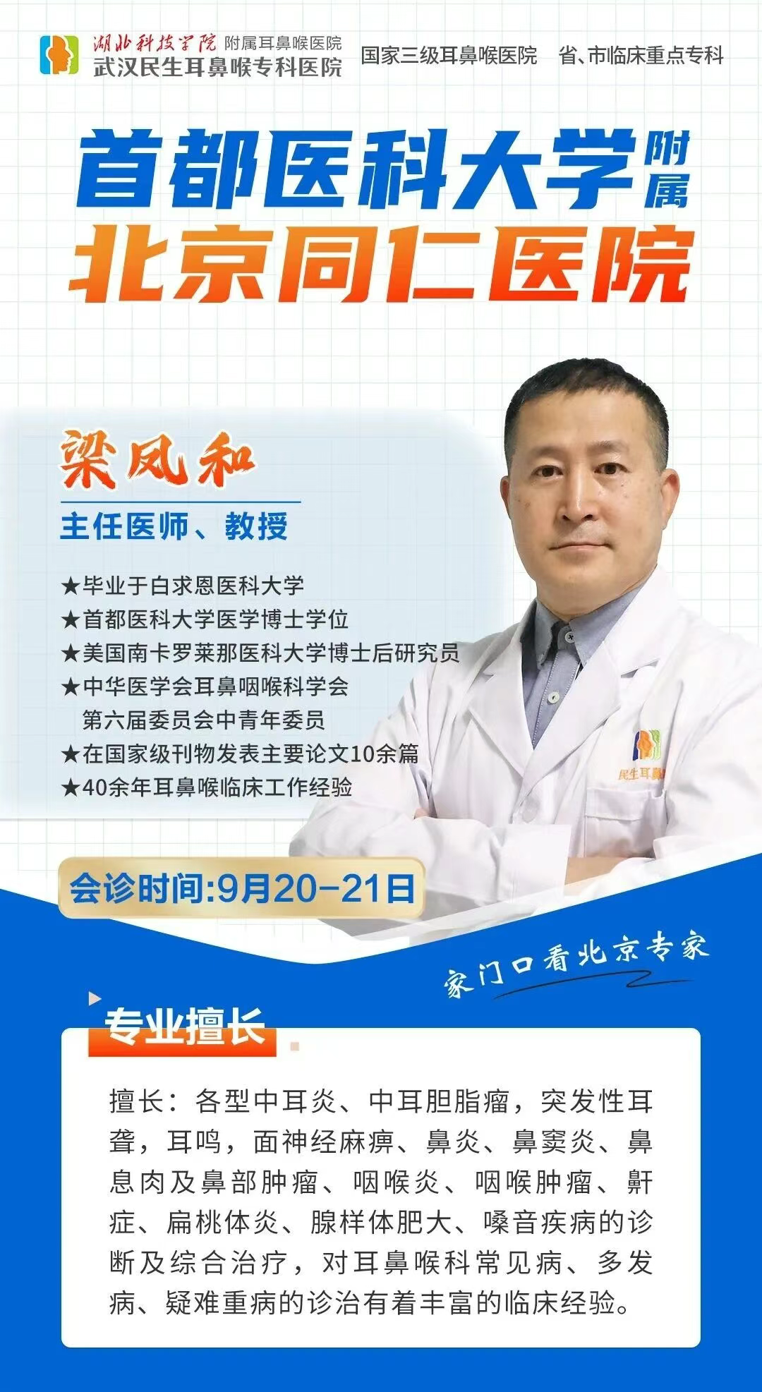 北京同仁医院梁凤和主任9月20-21日(周六、周日)亲临武汉民生耳鼻喉专科医院会诊,为武汉及周边患者提供专业、高效的诊疗服务,号源有限,先到先得,有需要的耳鼻喉患者请提前咨询预约。