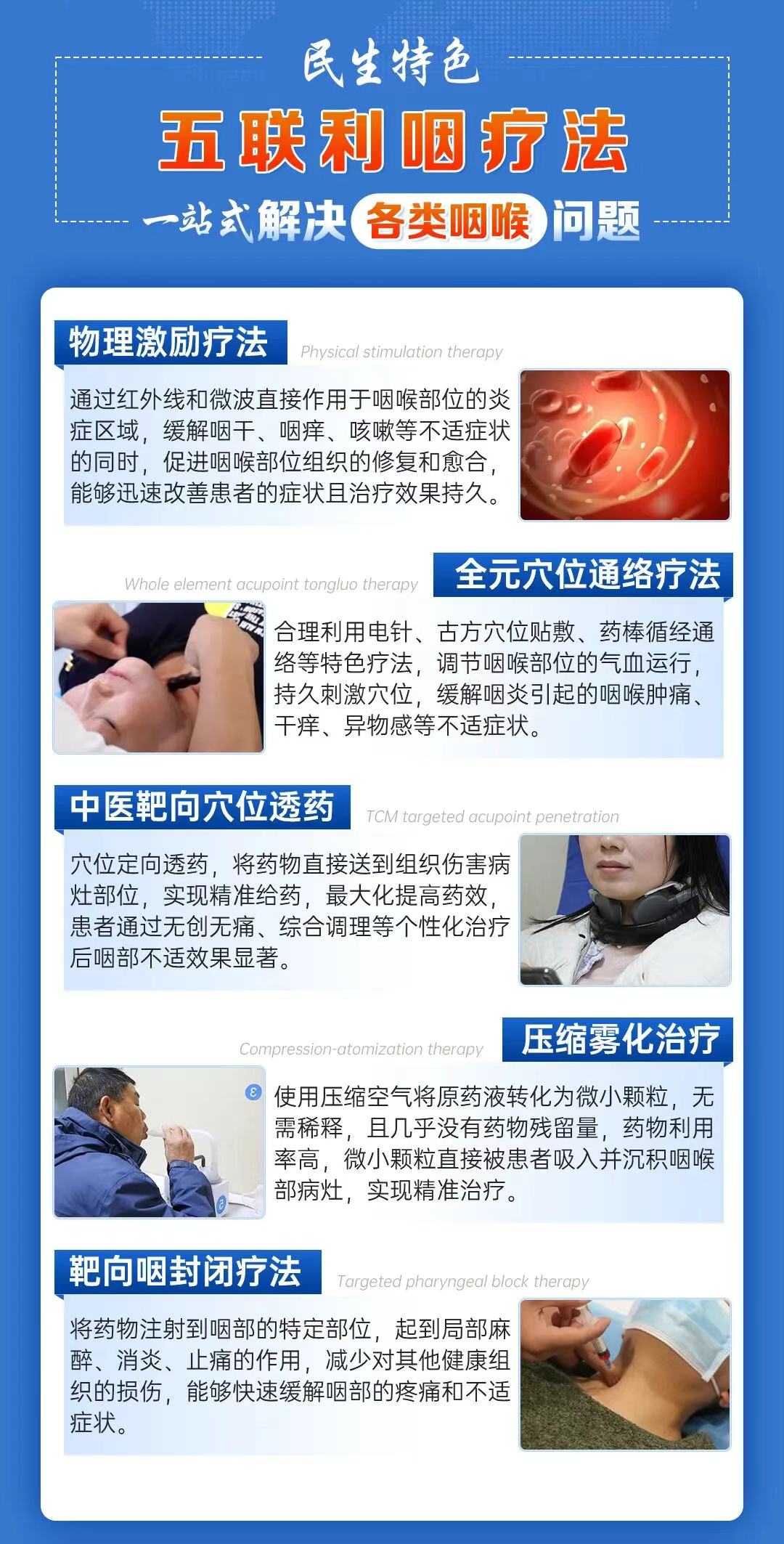 针对反流性咽炎“病根在胃、症状在喉”的特点,武汉民生耳鼻喉医院创新推出的中西医结合五联利咽疗法,通过理疗与药物协同作用,直接作用于咽喉部位。实现标本兼治,不手术、无痛苦,临床治疗急/慢性咽炎、反流性咽炎效果显著。