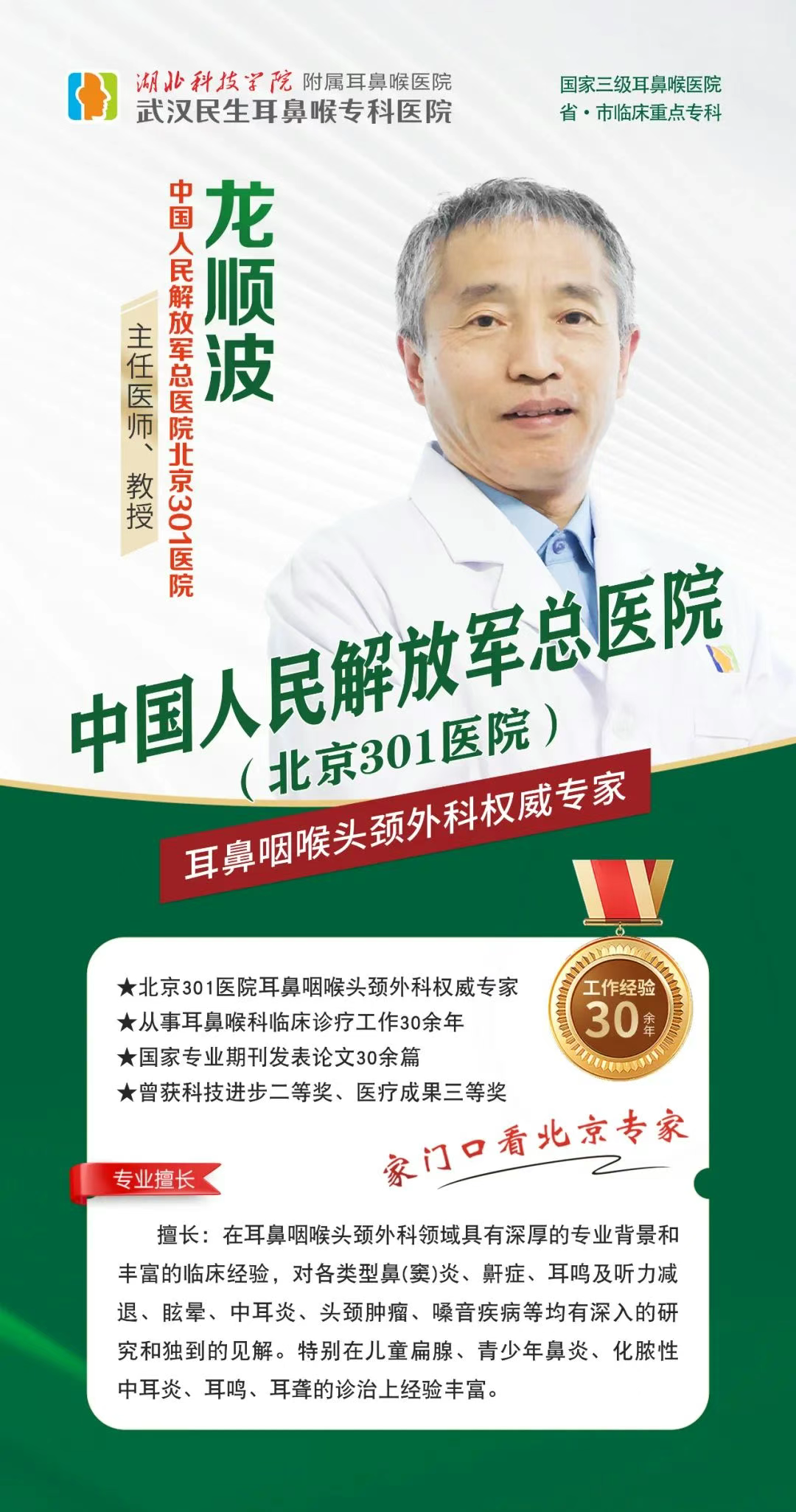 中国人民解放军总医院(北京301医院)龙顺波主任8月16-17日(周六、周日)亲临武汉民生耳鼻喉专科医院会诊,为武汉及周边患者提