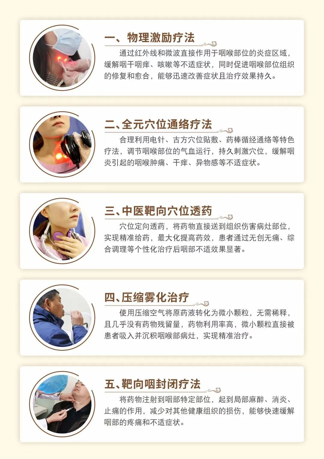 武汉民生耳鼻喉医院“五联利咽疗法”通过中西医结合治疗方式:“理疗+药物"直接作用于咽喉部位,按照人体经络分布,锁定病灶精确注射药物治疗,启动患者自我保护和防御体系,加快患者病变部位的恢复,改善气血失调、咽喉失养、气血痰浊郁滞等咽喉不适情况。