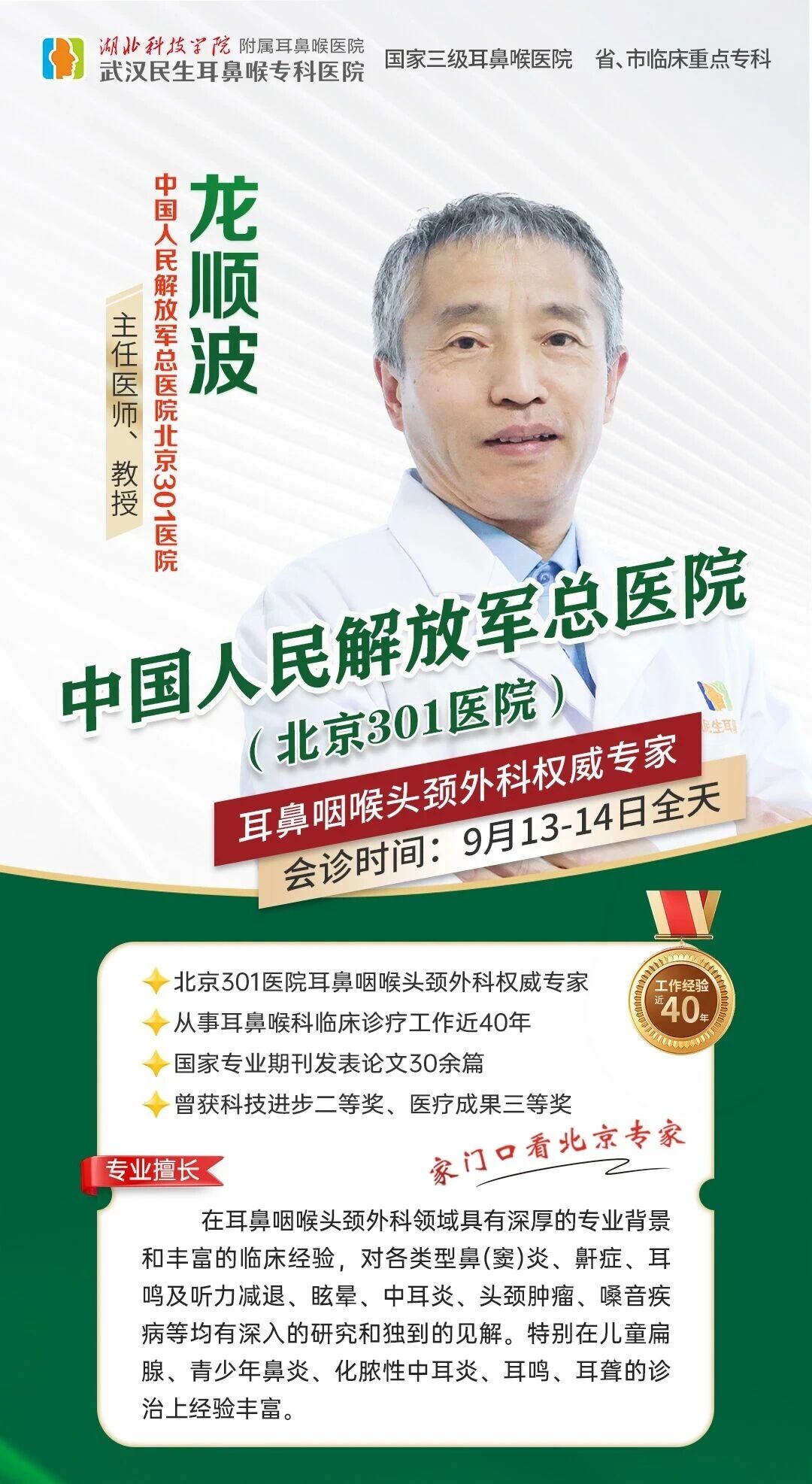 中国人民解放军总医院(北京301医院)龙顺波主任9月13-14日(周六、周日)亲临武汉民生耳鼻喉专科医院会诊,为武汉及周边患者提供专业、高效的诊疗服务,号源有限,先到先得,有需要的耳鼻喉患者请提前咨询预约。