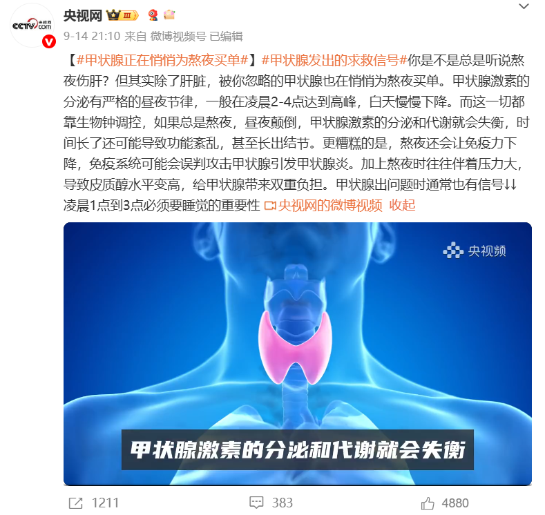 央视网报道指出,熬夜伤肝,但被忽略的甲状腺也在悄悄为熬夜买单,甲状腺激素分泌具有严格昼夜节律:凌晨2-4点达高峰,白天逐渐下降。长期熬夜、昼夜颠倒会导致激素分泌紊乱,引发甲状腺异常。